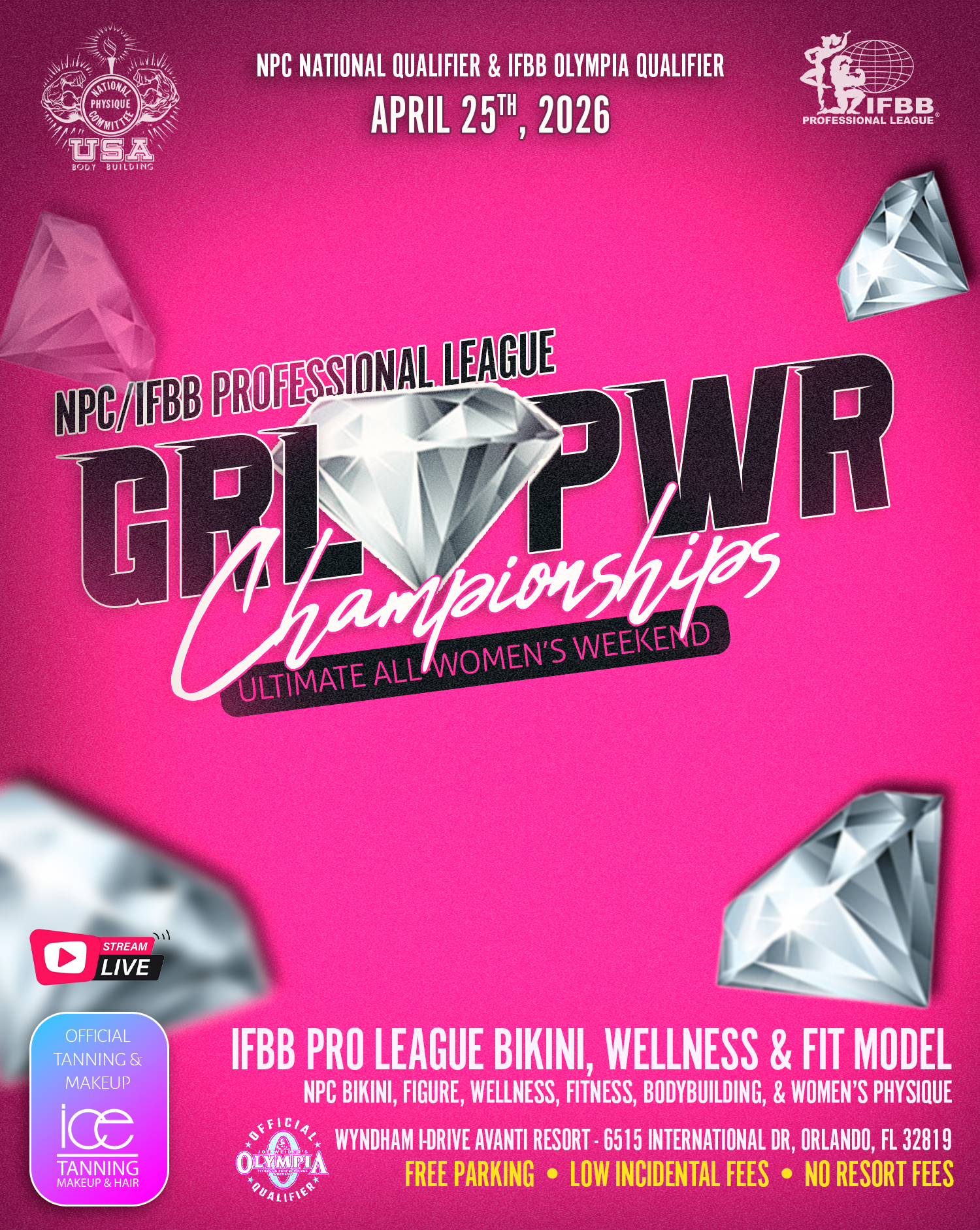 We can’t wait to have YOU grace the stage of the fourth Annual NPC/IFBB GRL PWR Championships! THE Premier ALL-FEMALE Event. This VERY special weekend dedicated to the WOMEN in our Sport is designed to treat you like the VIP STAR that you ARE! Our Bombshell Productions Dream Team is here to make YOUR weekend stress-free, exciting and most of all FUN!!